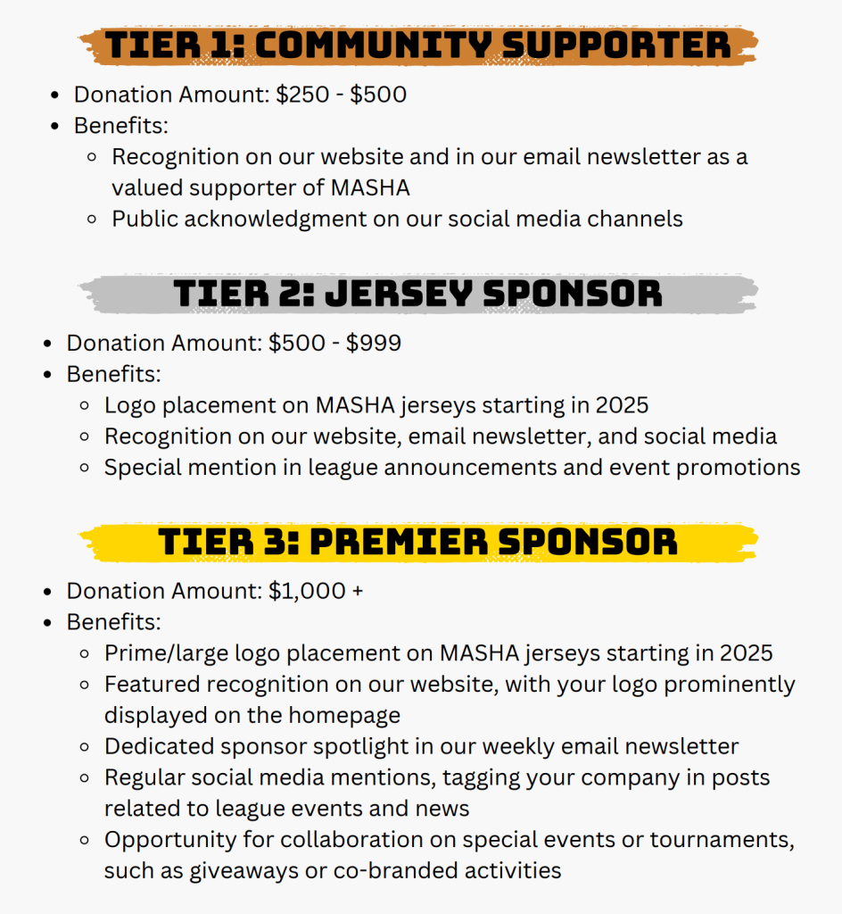 We offer various options, from recognition on our website to prime logo placement on our jerseys starting in 2025. These tiers are designed to provide meaningful exposure for your brand while helping MASHA continue to grow.